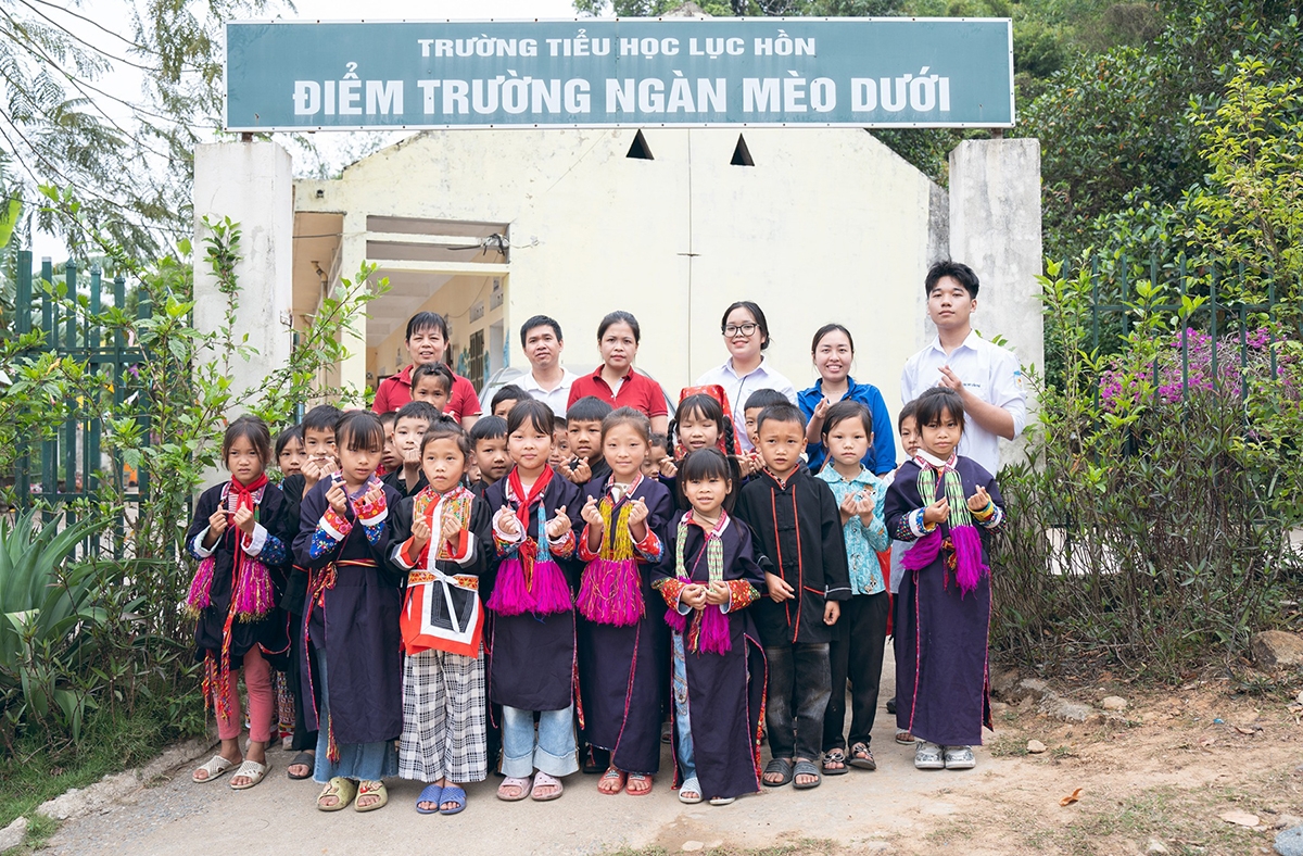 Phan Thị Thanh Trà (áo trắng hàng sau) cùng các thành viên dự án và các em học sinh điểm trường Ngàn Mèo Dưới trong buổi trao tặng Tủ sách hy vọng